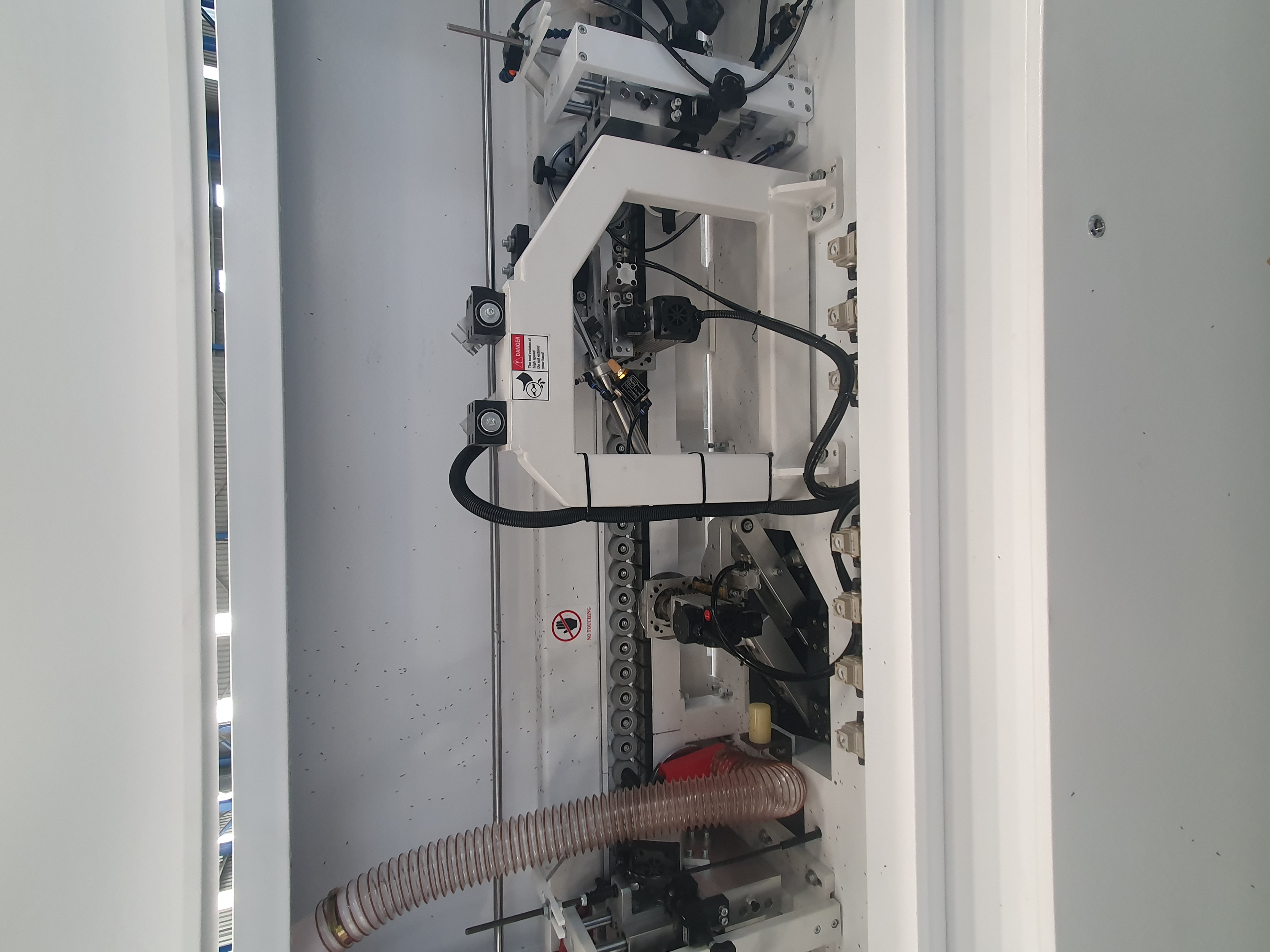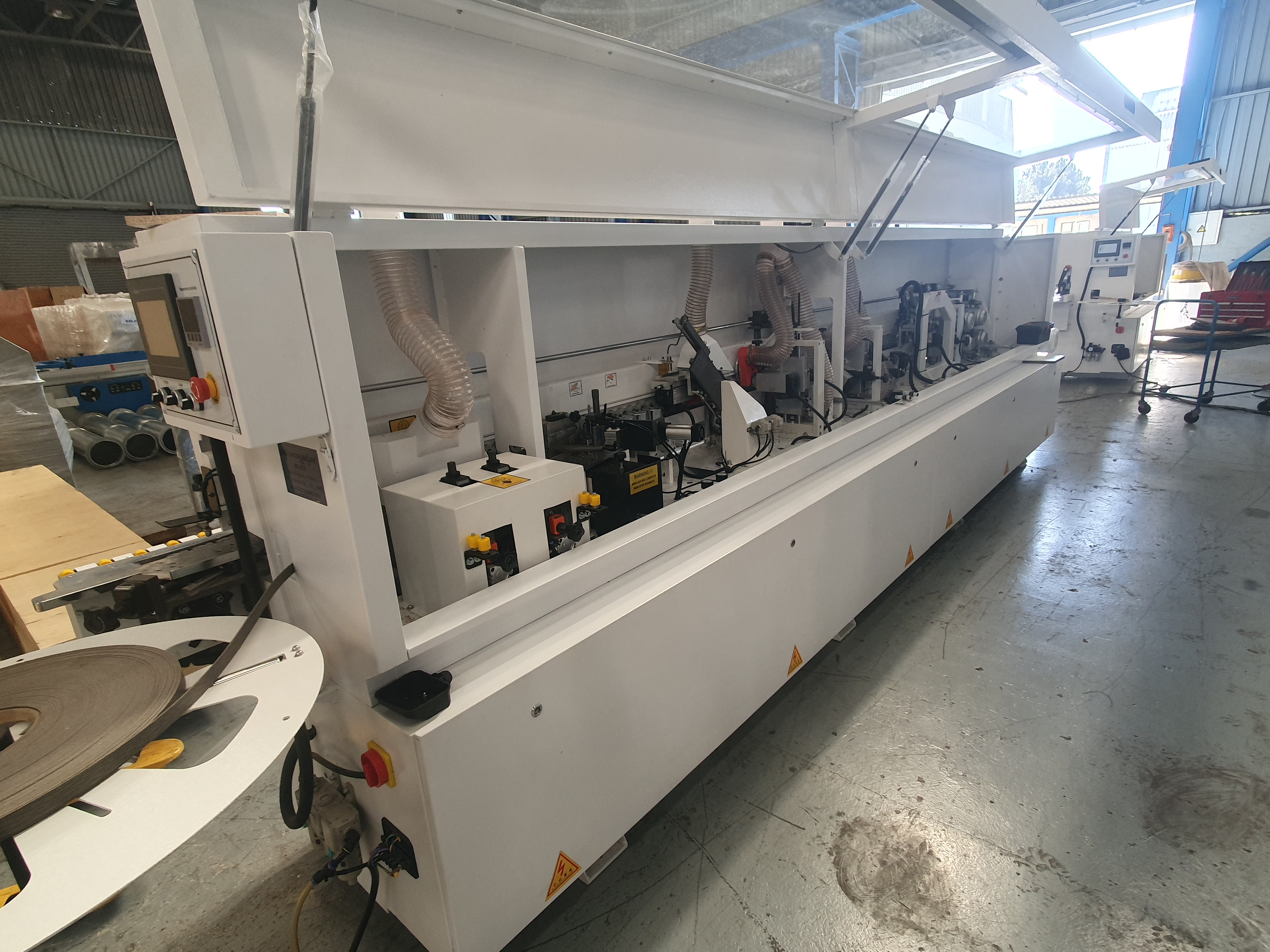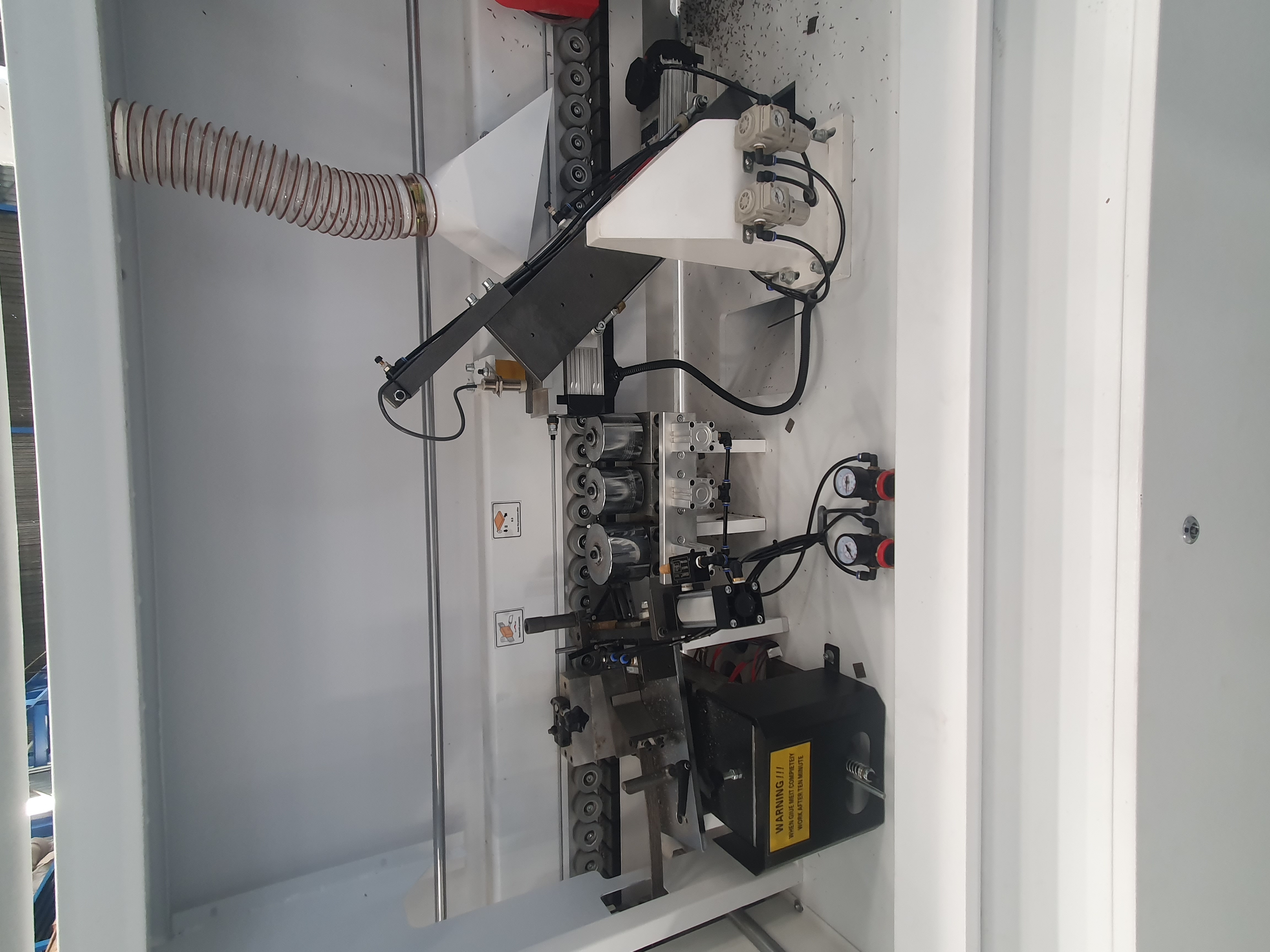 This full house edge bander is awesome to say the least! It includes 3 speeds max 21mt per min, touch screen control, pre-milling unit with 2 high speed diamond tip router bits, glueing station, 2 saws front and back trimming, top and bottom radius trimming with high frequency motors and analogue readout for easy adjustment. The best corner rounding station using 2 saw motors, radius scrappers and analogue readout, spraying liquids before the buffers, this machine really puts out a great edge that needs no further cleaning!
