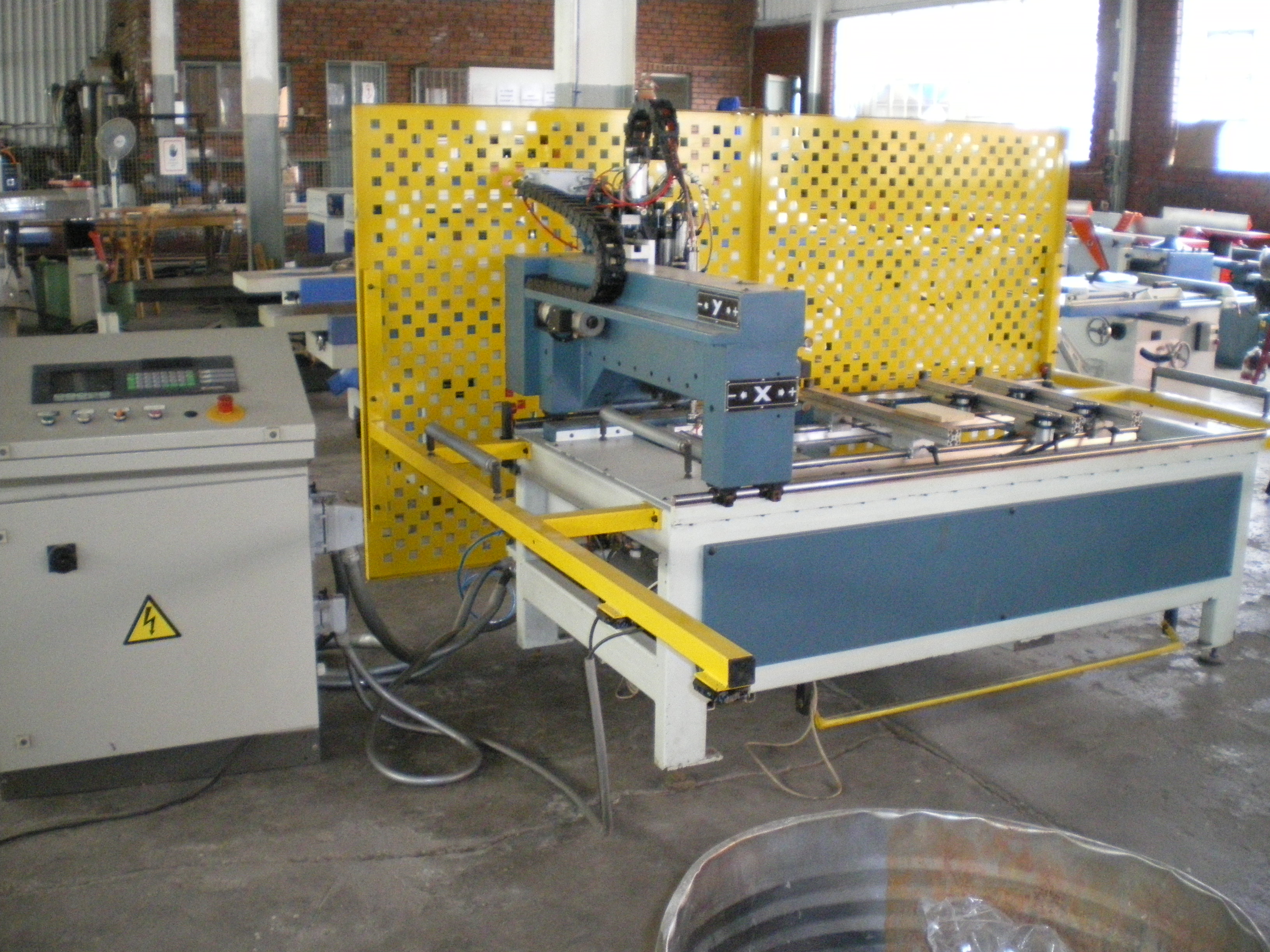 | this machine is great for building carcass's, its fully automatic and controlled by a numetric controller, so all the holes are programmed and the head moves over the work piece completing all the locating holes, it includes horizontal drilling and a saw blade for grooving in the x axiz.a great value for money machine. | ||