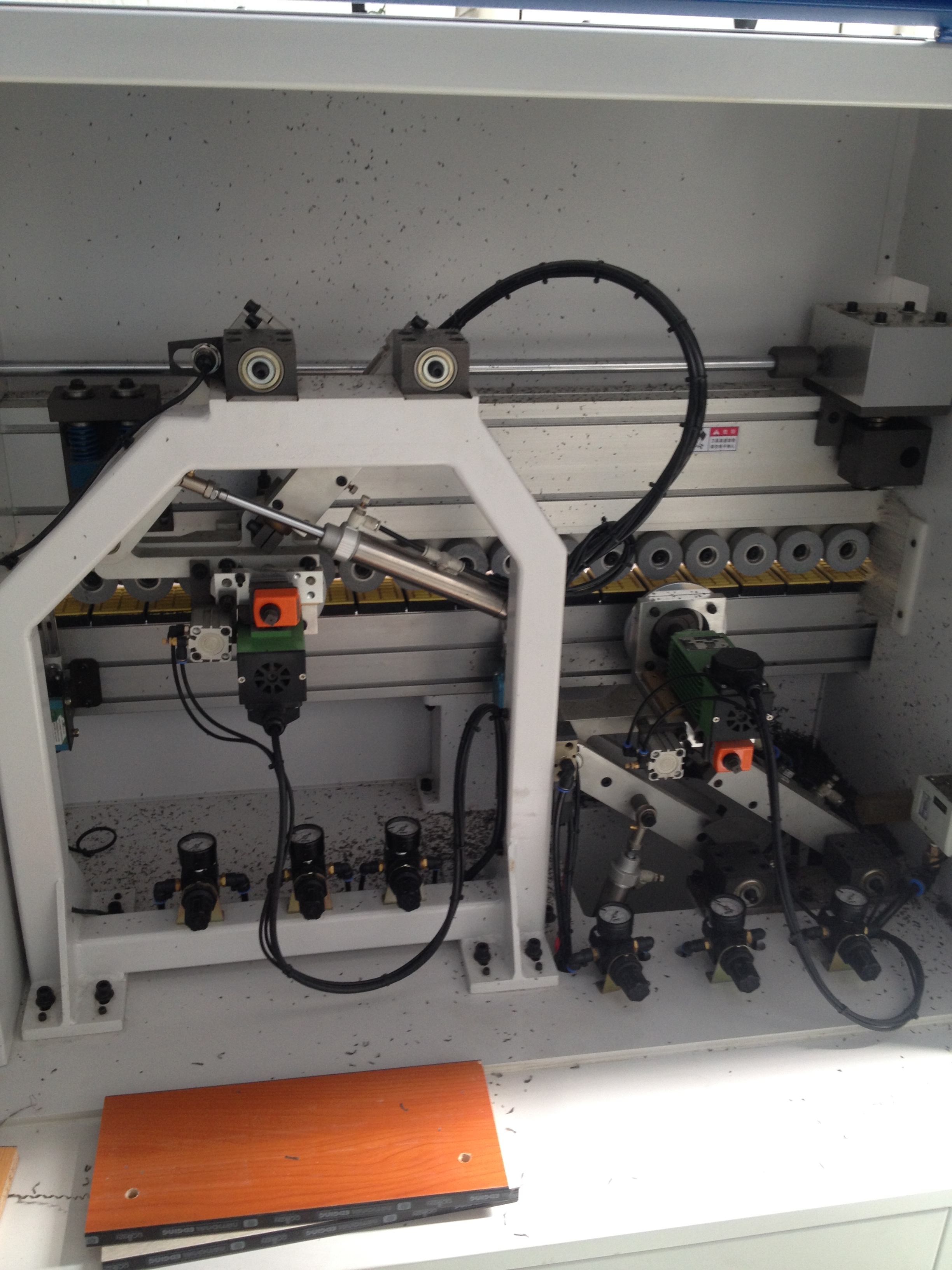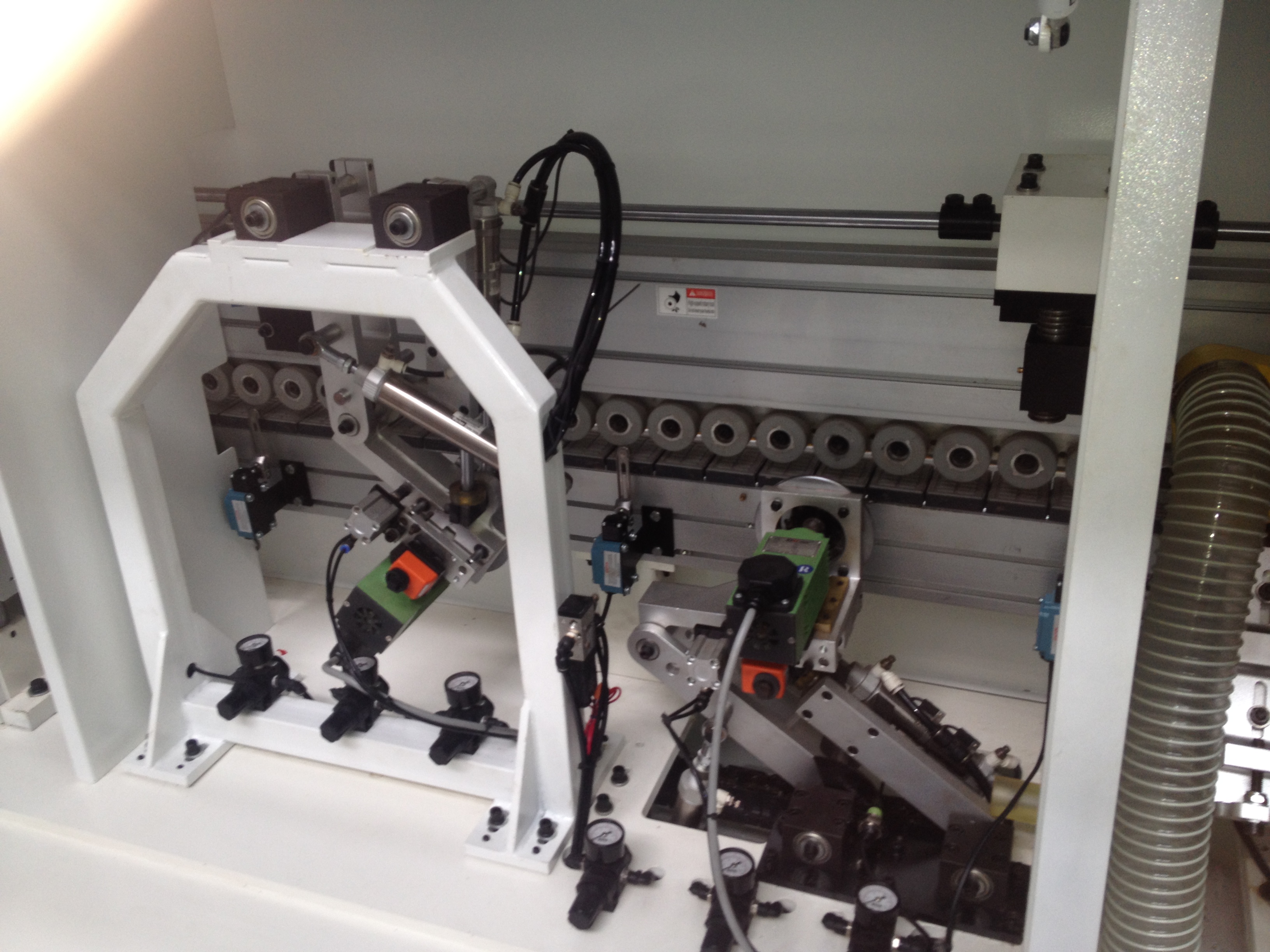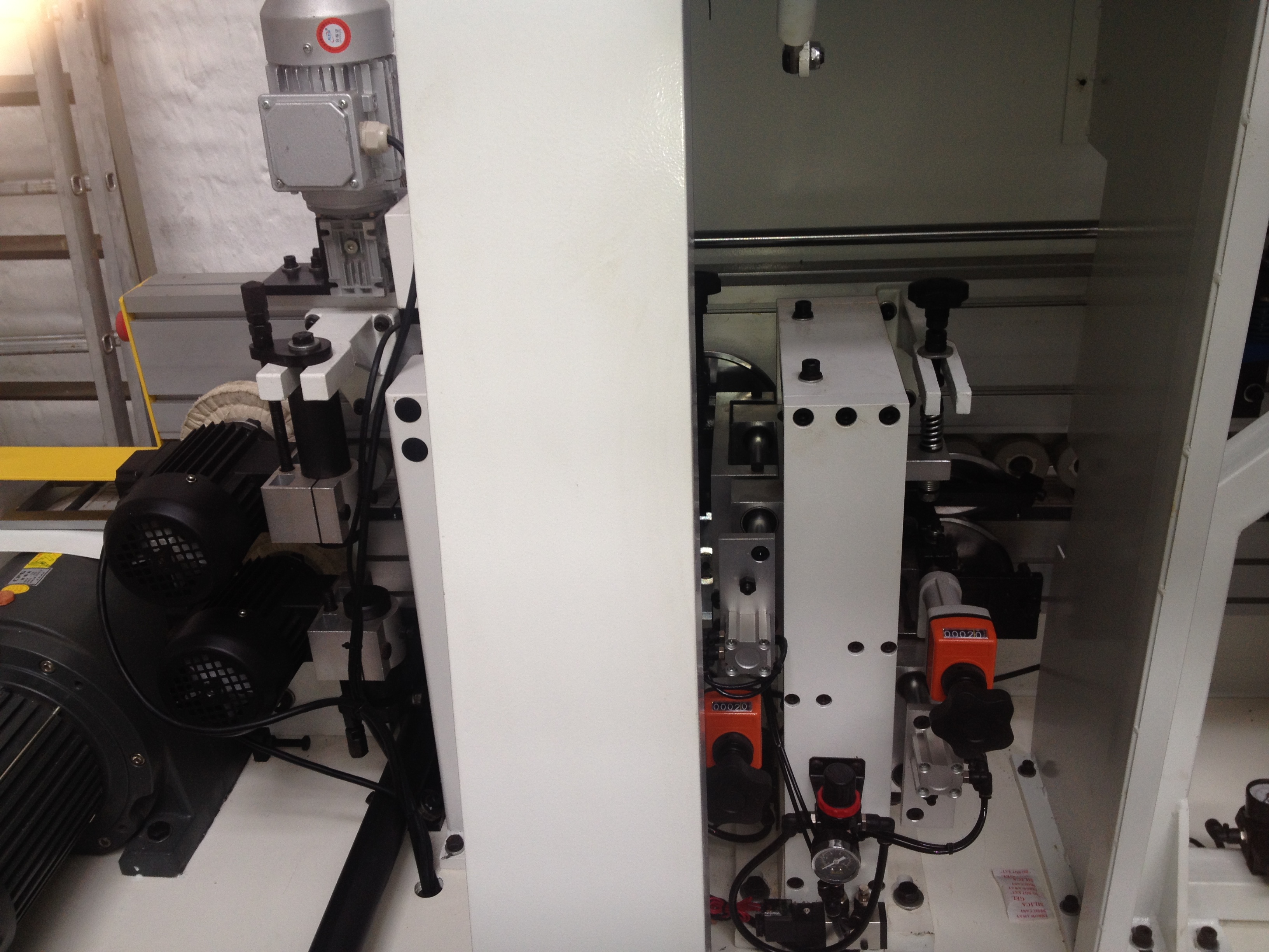 This Edgebander is a great machine, really good value for money, With 3 speed adjustment, max 21 meters per minute. A touch screen control, 2 saws motors front and back, 2 top and bottom trimming stations with pneumatic automation for easy adjustment between stations, one radius station, one flat. 2 trimming motors for corner rounding (working at 21m/min). Radius scraper with analogue readout adjustment with pneumatic automation