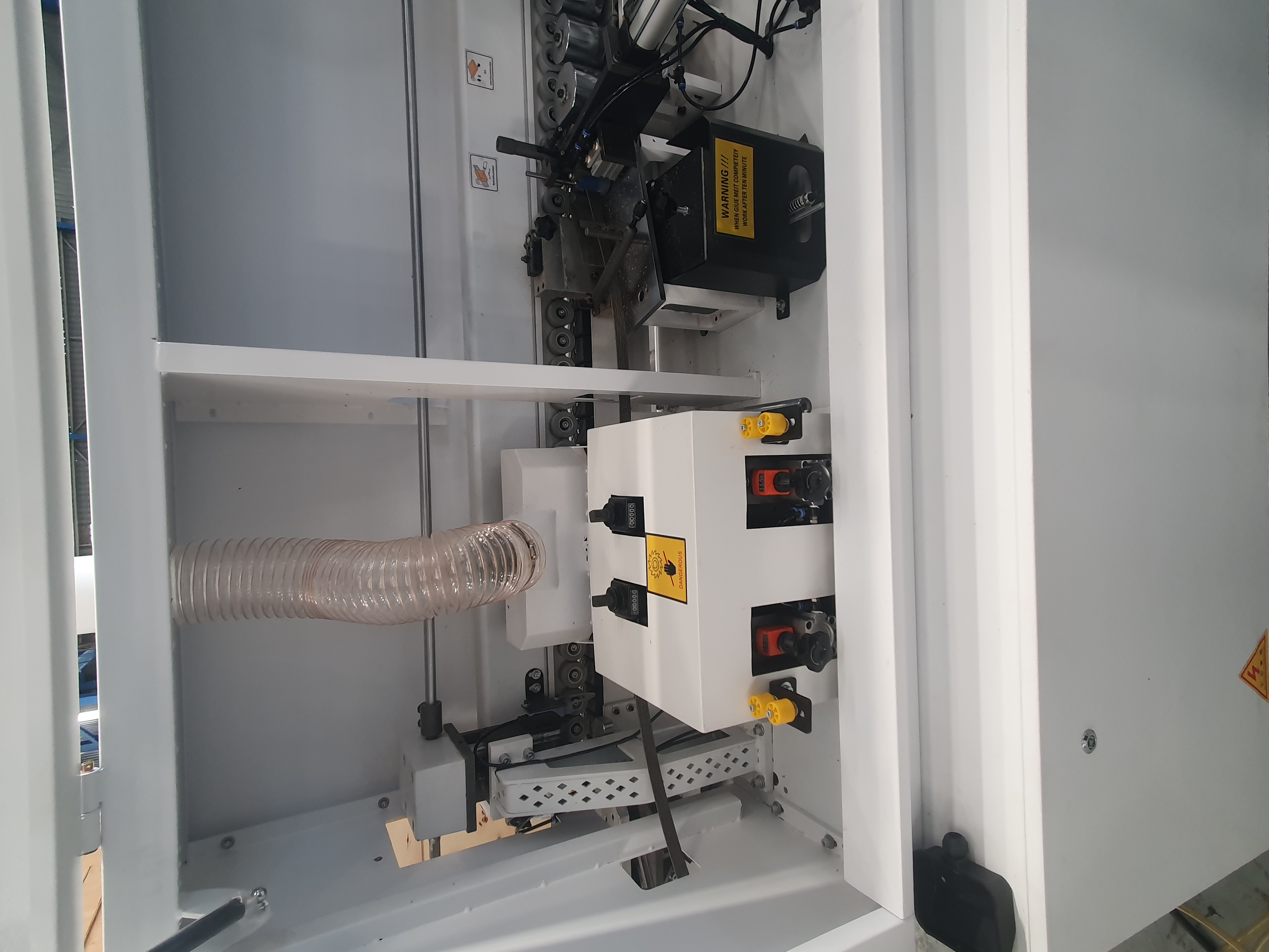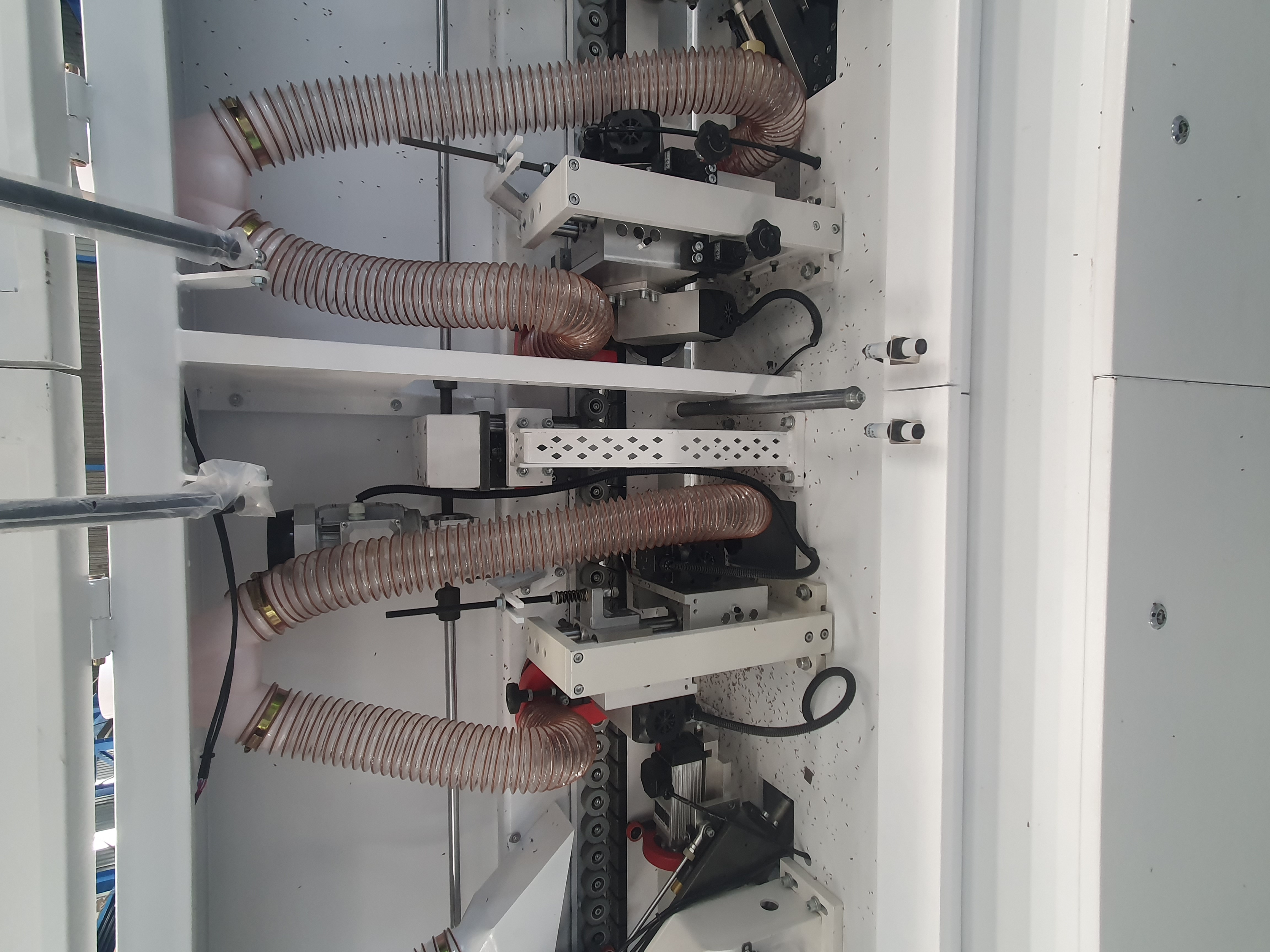 This full house edge bander is awesome to say the least! It includes 3 speeds max 21mt per min, touch screen control, pre-milling unit with 2 high speed diamond tip router bits, glueing station, 2 saws front and back trimming, top and bottom radius trimming with high frequency motors and analogue readout for easy adjustment. The best corner rounding station using 2 saw motors, radius scrappers and analogue readout, spraying liquids before the buffers, this machine really puts out a great edge that needs no further cleaning!