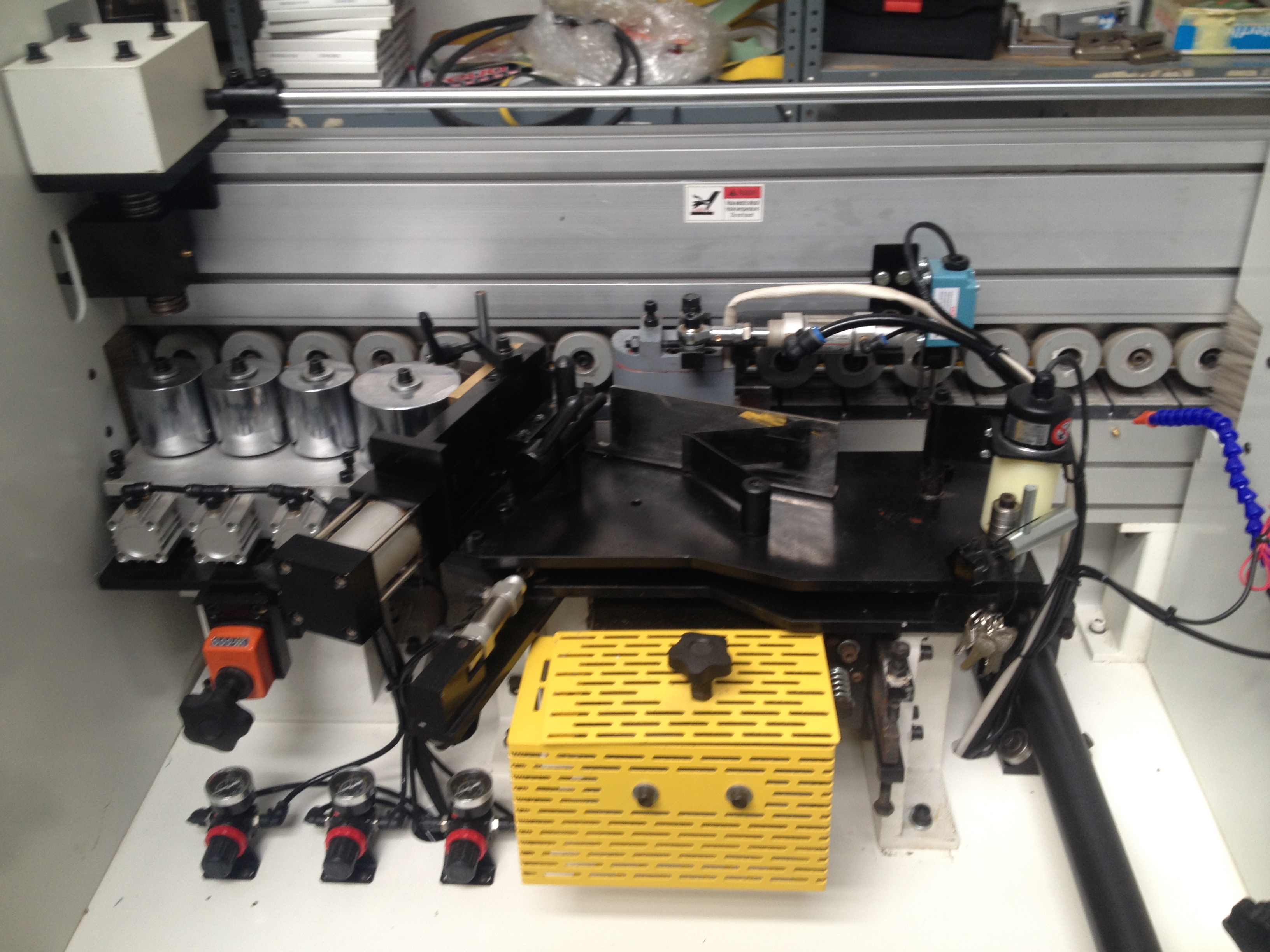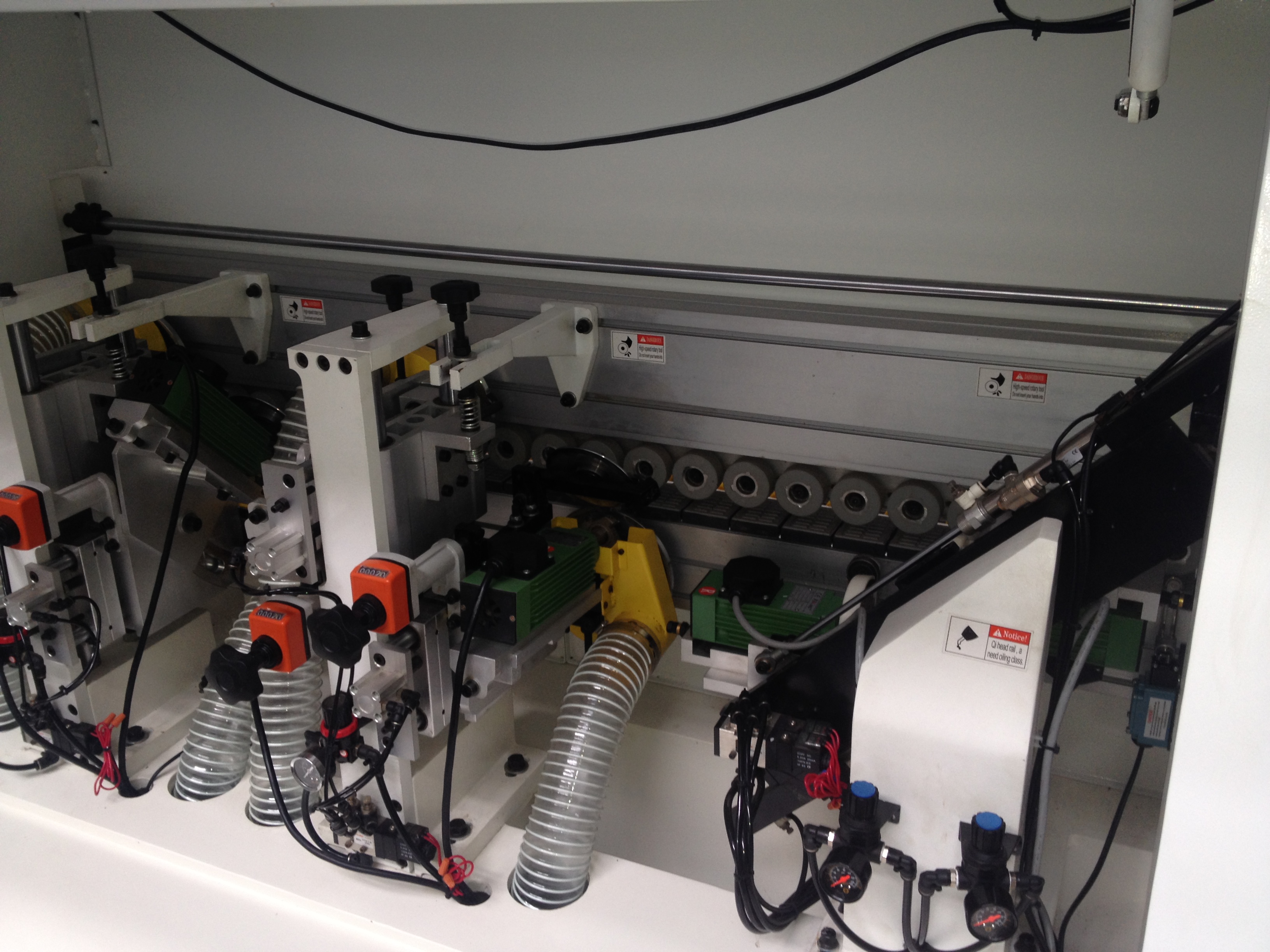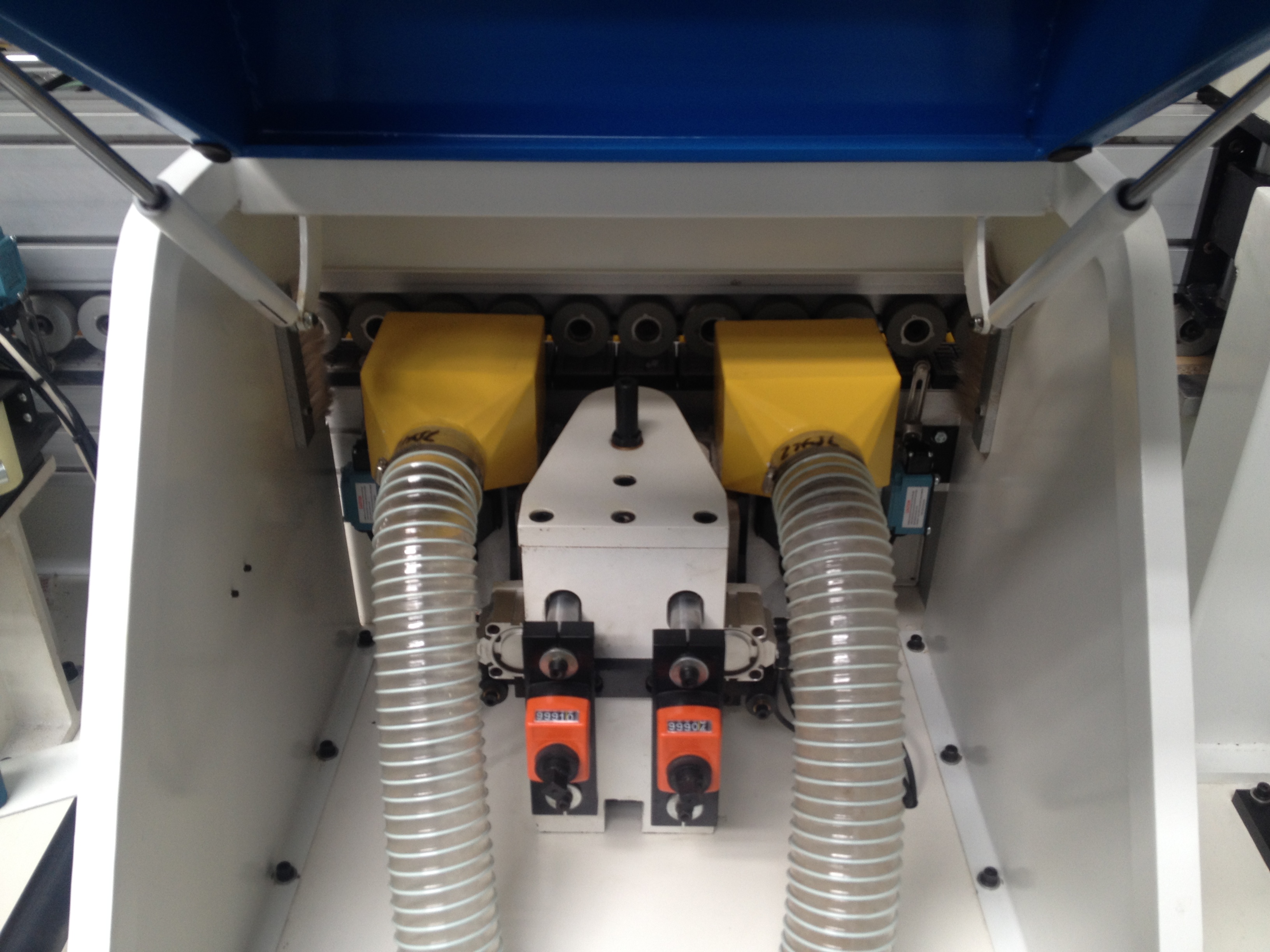 this machine is a great edgebander, its fast and includes premilling, the premilling station is 2 high speed diamond router bits that take of the thickness of the edging before the glue is applied to the edger, this gives a perfect start and allows the glue to be put on a cleaner face, the router cutters also take of the scorer chips and allow the factory to cut the components finished size and then the routers take of the thickness of the edging and then the edging is glued onto the face making it the same size again.