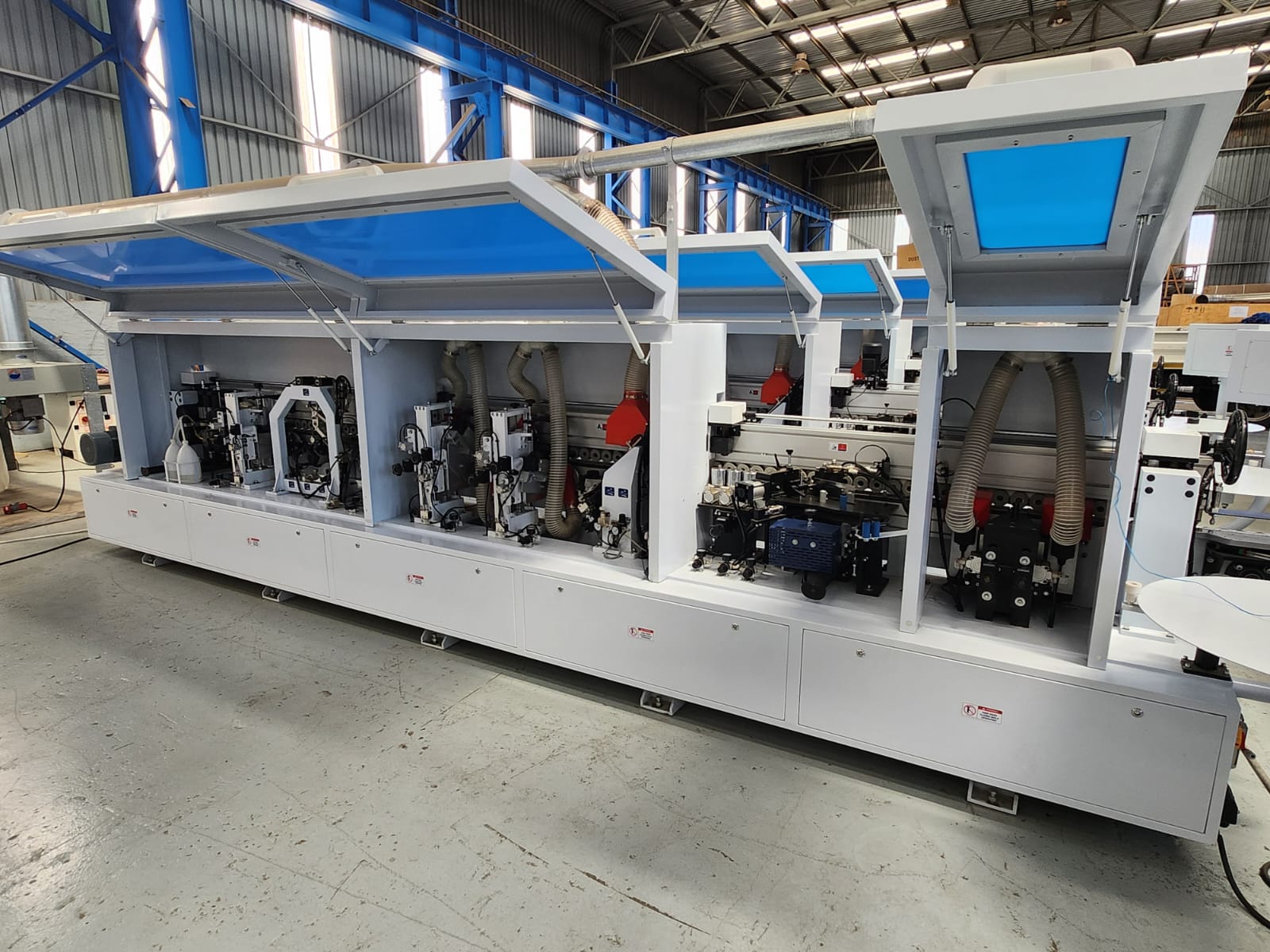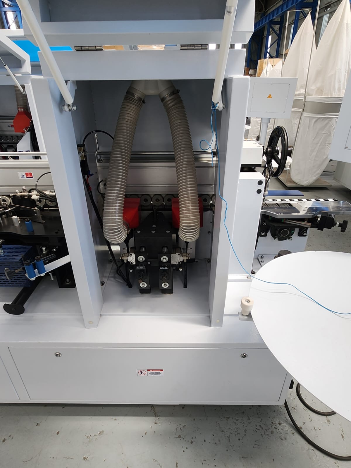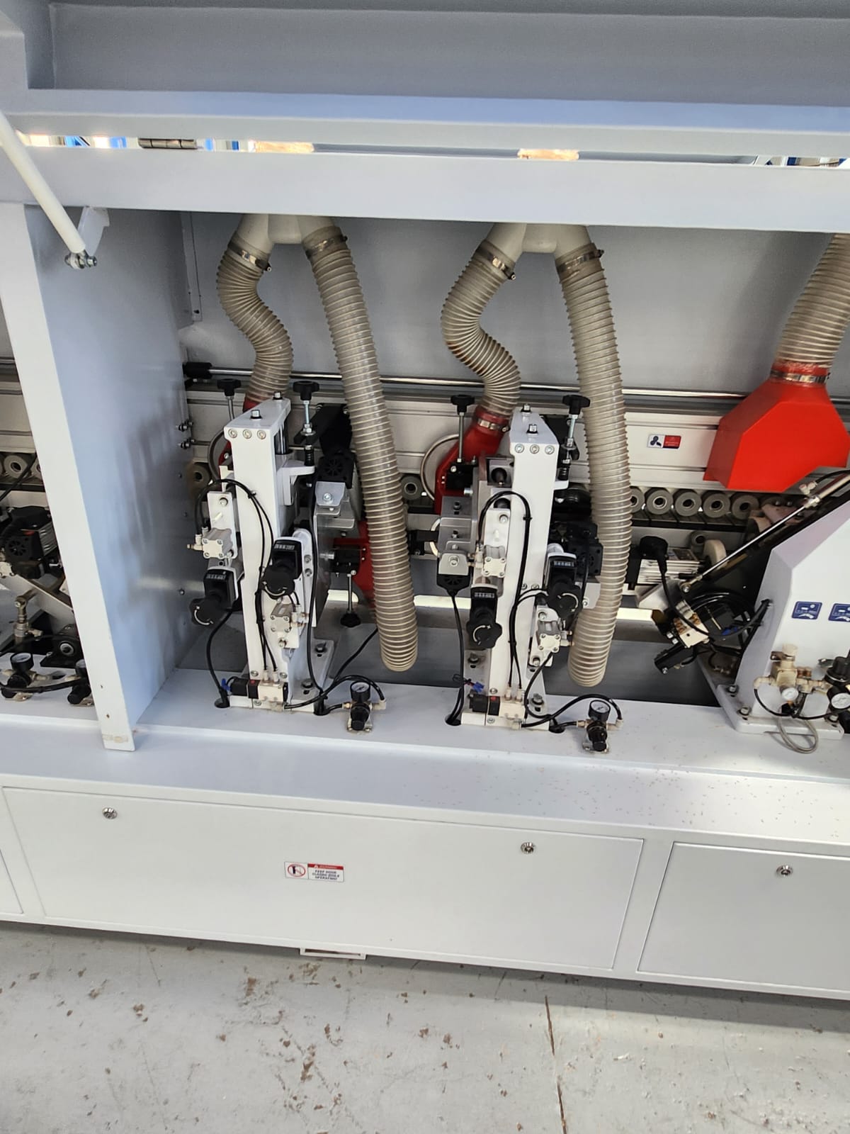 This full house edge bander is awesome to say the least! It includes 3 speeds max 21mt per min, touch screen control, pre-milling unit with 2 high speed diamond tip router bits, glueing station, 2 saws front and back trimming, top and bottom radius trimming with high frequency motors and analogue readout for easy adjustment. The best corner rounding station using 2 saw motors, radius scrappers and analogue readout, spraying liquids before the buffers, this machine really puts out a great edge that needs no further cleaning!