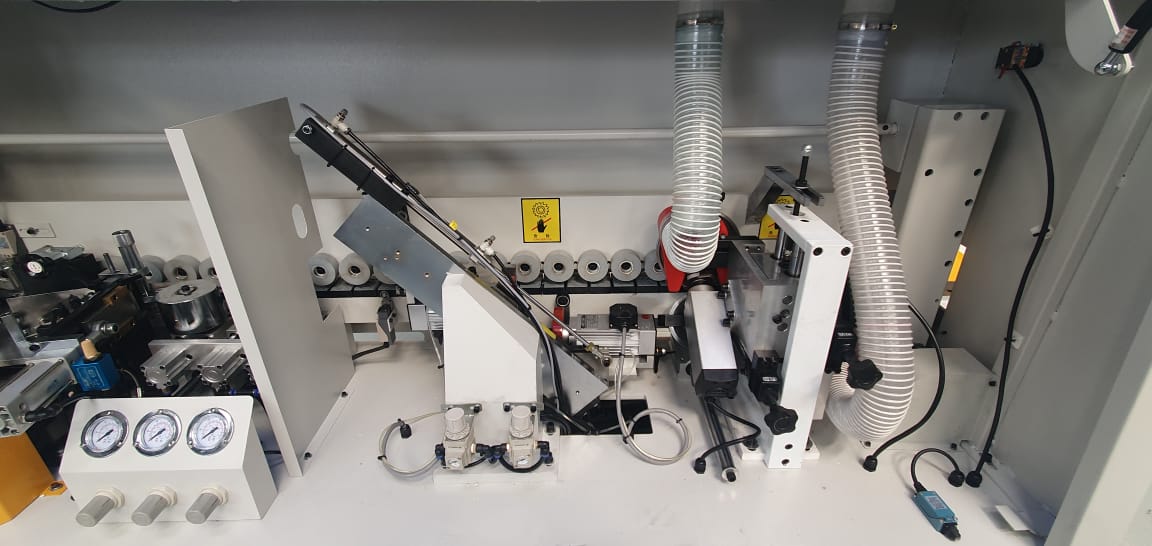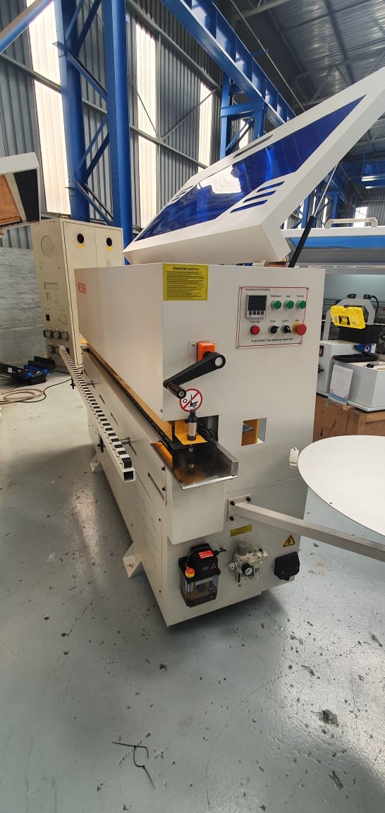 This is the perfect start up machine, especially if the budget is tight. Allwood has had the machine manufactured to be economic, but not taken any short cuts. The machine works at a slightly slower speed than the bigger model (6m/min +-walking speed) but with the slower speed the machine has the longer cutting time on the bottom edge giving the finished product a good edge. This edging machine also has 2 saw motors for front and back trimming - this makes it a nice smooth action and very easy to set up. This also allows for the front and back trimming to work on short sides like a 146mm drawer front. Some of the cheaper models from the opposition only have one saw motor with a blade on each side, this system does not work so well on short pieces and has more moving parts so more likely to fail. Our machine does not take up much factory space and is easy to move around if needed. This is a perfect first time edger and will be a great buy for any business.